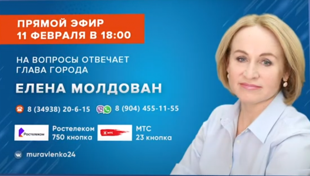 Вопросы мы принимаем уже сегодня. Их можно оставлять в группах «Муравленко 24» и «Муравленковский день» в социальной сети «ВКонтакте», а также по телефону нашей редакции: 20-5-26. Кроме того, вы можете отправить нам свои вопросы при помощи мессенджеров WhatsApp и Viber по номеру: 8-9044-55-11-55. Прямой эфир с главой города Еленой Молдован состоится в этот четверг на телеканале «Муравленко 24» в сети Ростелеком на 750-м канале и в МТС на 23-м. Трансляцию мы будем вести и в группе «Муравленко 24» во «ВКонтакте».