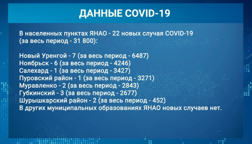 В населенных пунктах ЯНАО - 22 новых случая COVID-19 (за весь период - 31 800):