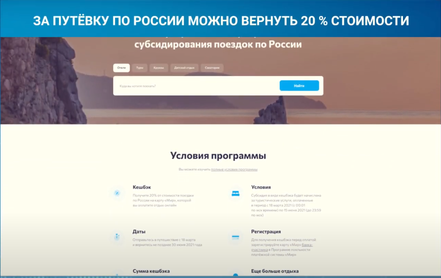 Ямальцы могут вернуть 20 % от стоимости поездки по России. Рассчитывать на кешбэк могут те, кто оплатит путешествие до 15 июня. Вернуться из поездки нужно не позднее 30 июня.