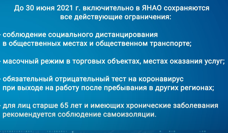 До 30 июня 2021 г. включительно в ЯНАО сохраняются все действующие ограничения: