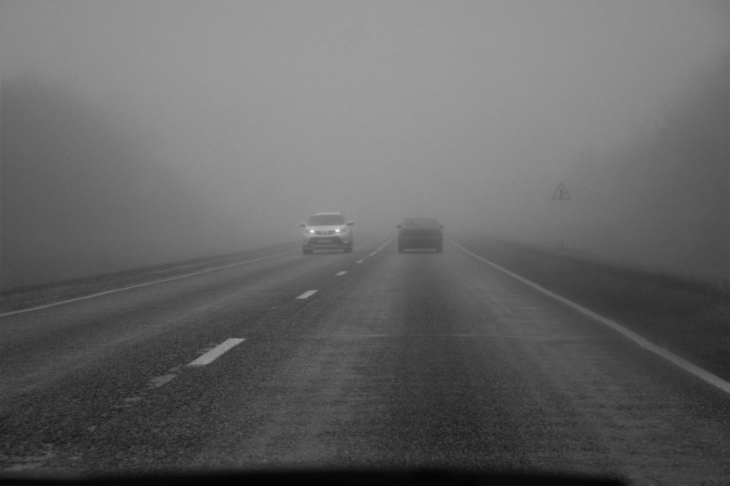 На загородной трассе плохая видимость из-за тумана