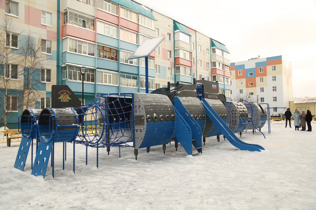 Оригинально выглядит и детская площадка между 11-м и 13-м домами на улице Муравленко. Построена она на средства из местного бюджета. Количеством игровых форм объект не изобилует. Вся изюминка заключается в огромной подводной лодке. Заглянув внутрь, мальчишки и девчонки смогут почувствовать себя настоящими мореплавателями. Субмарина очень похожа на настоящую. Здесь установили множество различных приспособлений для лазанья: сетки, переходы, подвесной мостик, а также тоннели и лесенки.