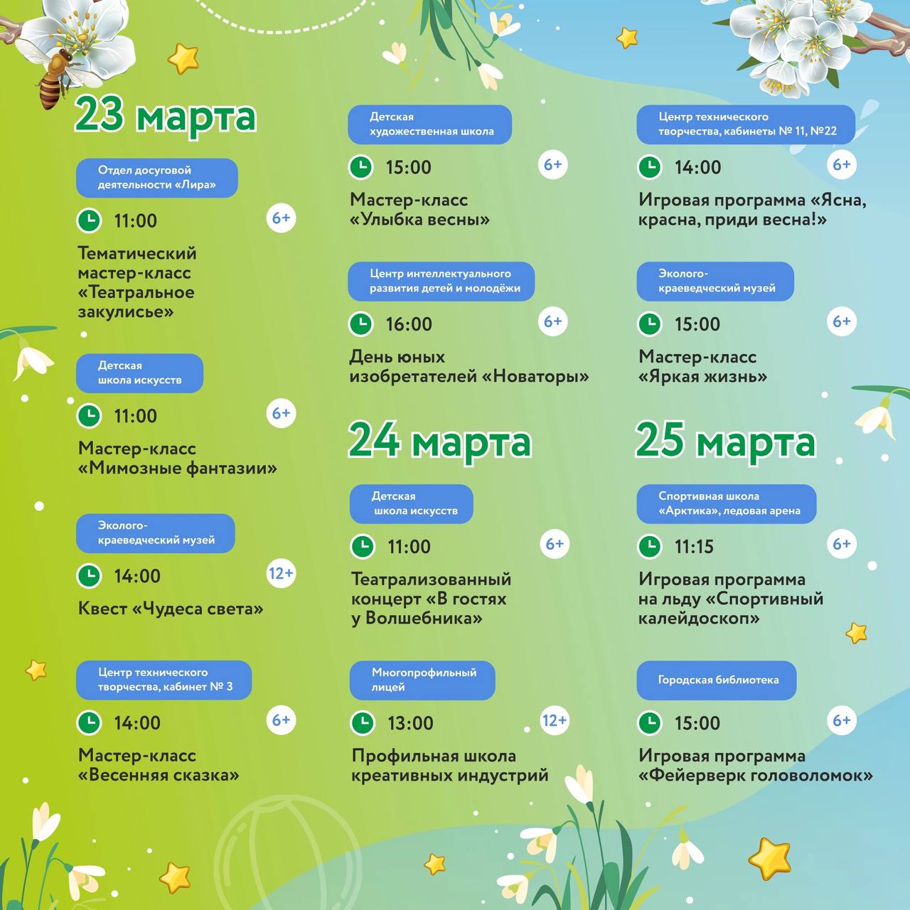 Школьников приглашают на тематические мастер-классы, квесты, интеллектуальные игры и спортивно-развлекательные программы. Также состоится день юных изобретателей, турнир по брумболу, иммерсивный театр, профильная школа креативных индустрий. «PRO-каникулы» пройдут с 23 по 30 марта.