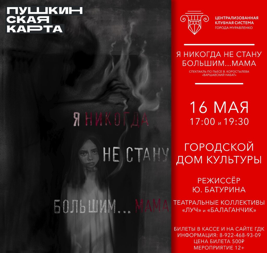 В главных ролях выступят артисты студий «Луч» и «Балаганчик». Артисты расскажут историю о героической судьбе польского учителя Януша Корчака и о том, как в любых ситуациях оставаться человеком. Премьера состоится 16 мая в Доме культуры. Посетить театр можно по Пушкинской карте.