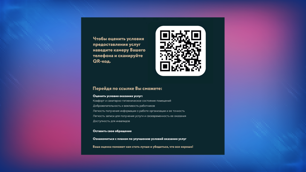 Оценить качество оказания услуг может каждый житель. Для этого необходимо принять участие в опросе. Мнение горожан учтут в дальнейшей работе учреждения. Деятельность организации оценивают по нескольким критериям. В их числе – открытость и доступность информации, комфортность, доброжелательность и вежливость сотрудников. Особое внимание уделяется доступности учреждений для маломобильных граждан и инвалидов.
